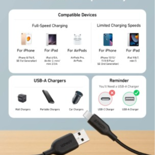 The Anker Powerline III USB-A to Lightning cable is a high-quality charging and data transfer solution, featuring a generous 6ft (1.8m) length and data transfer speeds up to 480Mbps. This black cable combines durability with performance for reliable everyday use with Apple devices.